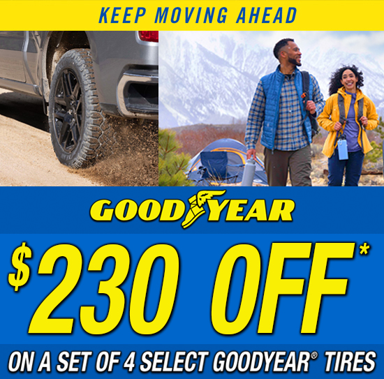 Receive a $180 Goodyear Visa® Prepaid Card by mail-in rebate when you purchase a set of 4 select Goodyear tires and make your purchase on the Goodyear Credit Card. Plus a $50 rebate for NEW Goodyear credit card accounts on first purchase of $250 or more.